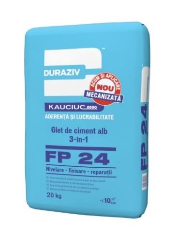 50,00 lei (TVA inclus)DURAZIV FP 24 - GLET DE CIMENT ALB 3-ÎN-1, ADITIVAT CU KAUCIUC, Nivelare-finisare-reparații, 20KG